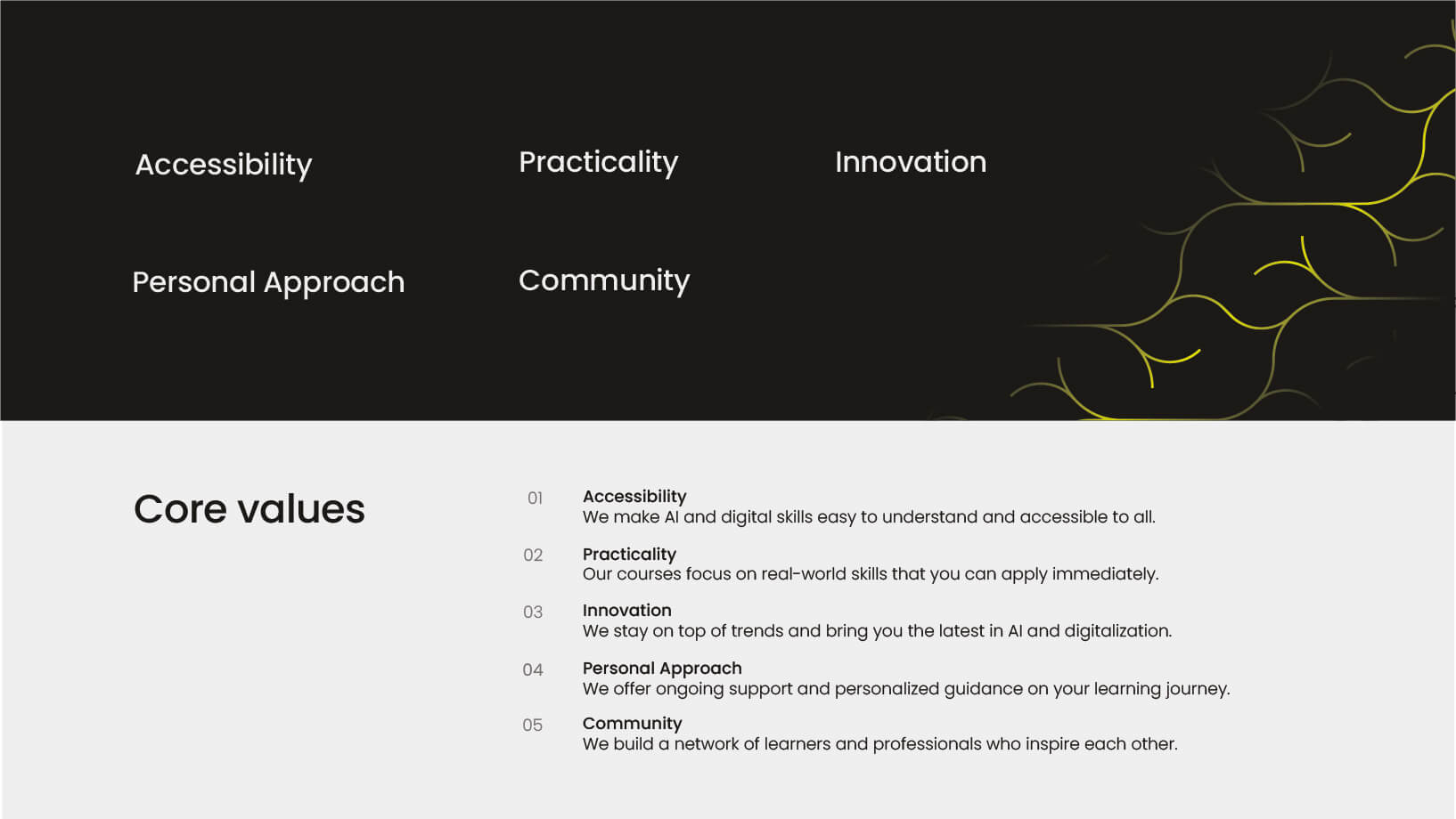 Digitáři is a project designed to educate individuals in the Czech Republic about artificial intelligence, helping those with limited experience learn how to use tools like ChatGPT. The in-person courses focus on practical AI applications, enabling participants to gain valuable skills. As a co-author, I contributed to the visual identity, including the logo inspired by a neuron, brand manual, business cards, and the website built on the Framer platform with 3D animations. We also coined the term "Digitáři," a neologism combining "digitalization" with a profession suffix, representing a community of individuals involved in digitalization. The project offers a professional and accessible approach to learning AI for personal and professional growth.